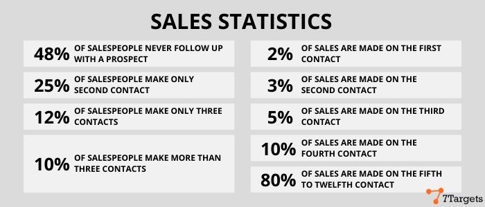 The above statistics say 48% of salespeople never follow up with the prospect. Whereas 80% of sales are made on the fifth to twelfth contact, but only 10% of salespeople follow up more than three times.