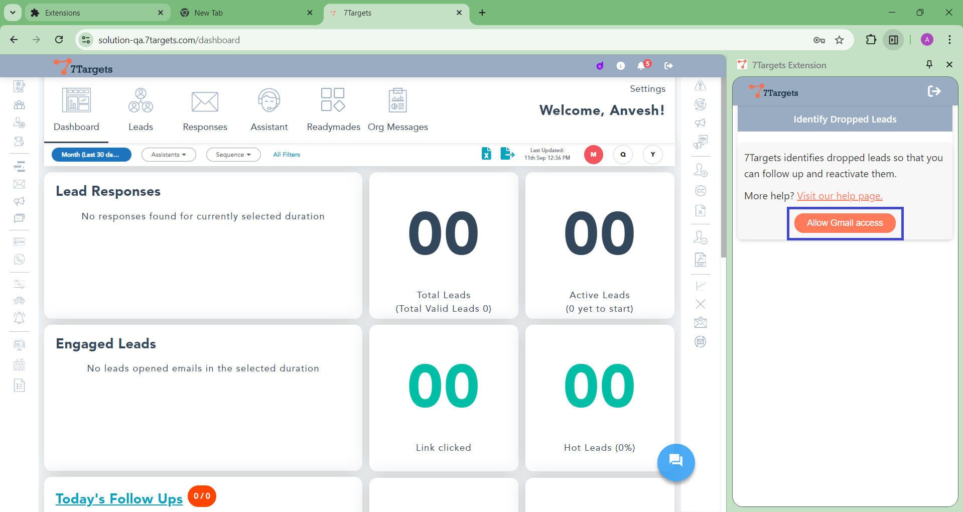 Once you’ve authorized the 7Targets Dropped Lead Extension and ensured it has access to your logged-in Gmail account, you can identify dropped leads. Here’s how: